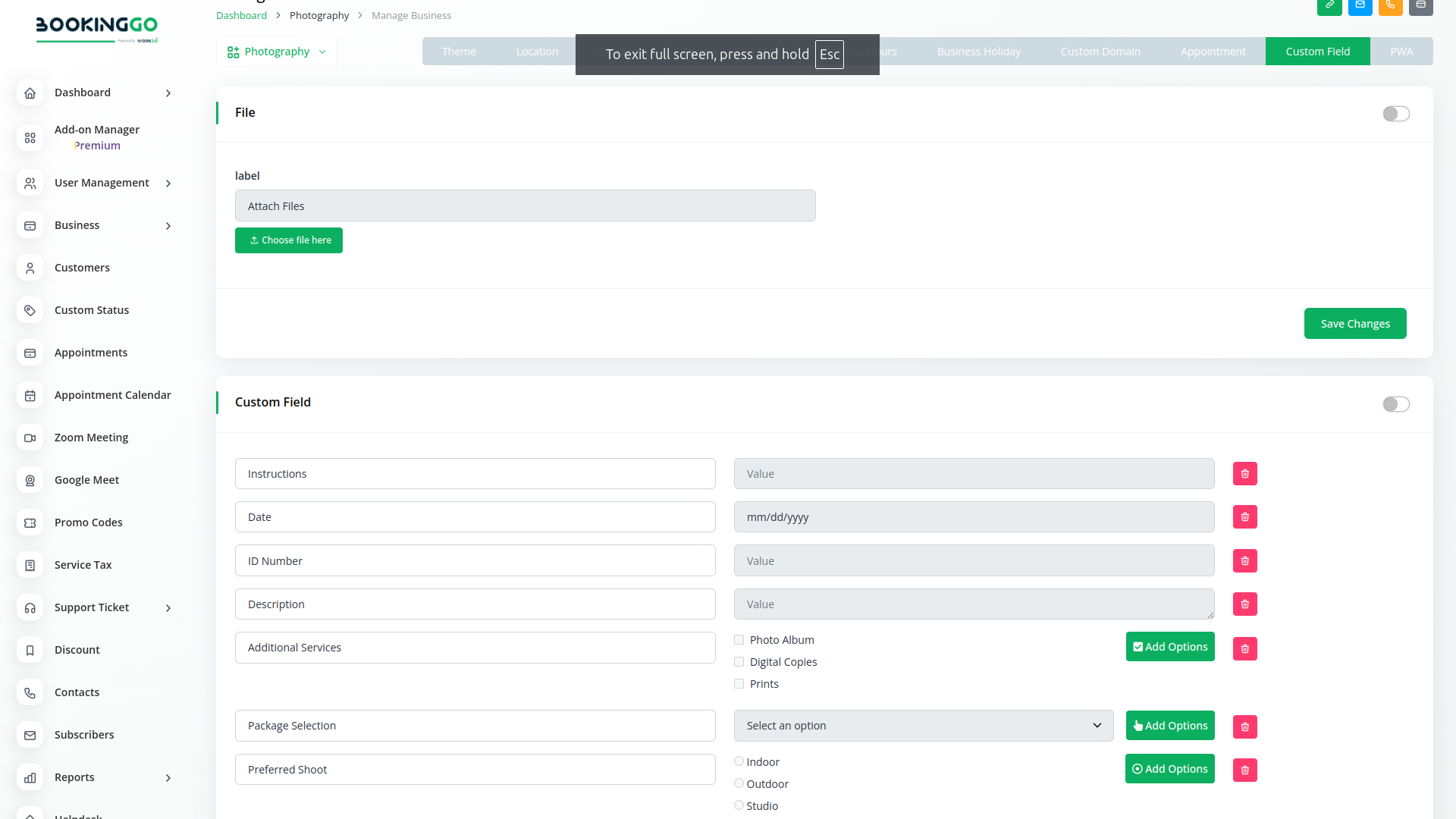 To leverage the capabilities of this module, you first need to ensure that the Additional Custom Field button is enabled in your BookingGo SAAS settings.Without this, you won’t be able to add any custom fields to your forms. The process is straightforward and typically involves navigating to the settings menu and toggling the button to activate the module, making it ready for further customization.